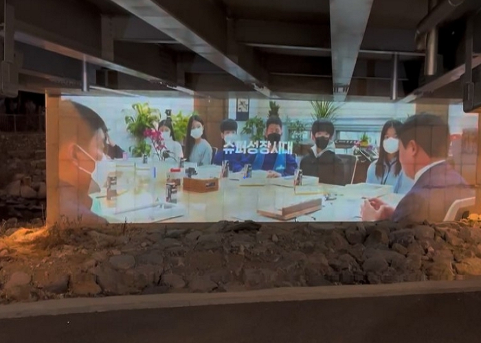 사능천 약대울교에는 경관조명과 영상시스템(교량하부)을 설치해 안전한 보행 환경을 조성했으며, 다양한 영상 콘텐츠를 투사해 수변공간과 조화로운 분위기를 연출했다.