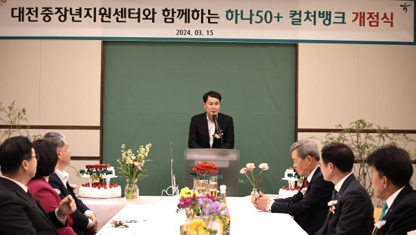 [뉴스서치] 대전시의회 이상래 의장은 15일 대흥동 소재 하나은행 대전지점에서 개최된 ‘대전 중장년 컬처뱅크 개점식’에 참석해 관계자들과 인사를 나누고 중장년을 위한 새로운 공간 마련에 감사의 마음을 전했다.