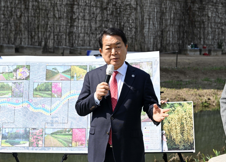 박 국장은 “먼저 하천 인근 회색빛 옹벽을 노란색과 붉은색으로 덮어 자연과 어우러지도록 목향장미(옹벽 연장 1㎞)와 붉은인동(0.3㎞)을 심어 빅플라워 커튼(1.3km)을 치는 방식으로 문제를 해결하겠다.”고 설명했다.