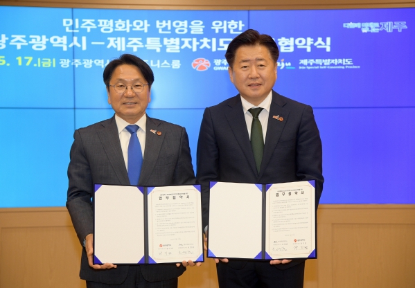 광주광역시와 제주특별자치도는 17일 오후 광주시청에서 강기정 시장과 오영훈 지사가 참석한 가운데 인권 평화와 번영을 위한 ‘상생발전 업무협약’을 체결했다.