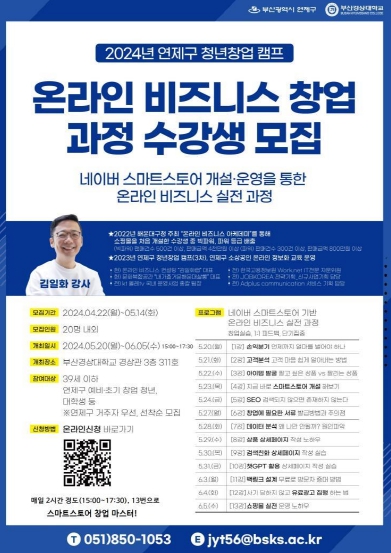 ‘부산창업가꿈 연제’에서 진행하는 청년창업 캠프에서는 온라인 비즈니스 기초, 고객분석, 아이템 발굴, 스마트스토어 개설, 쇼핑몰 운영 노하우 등 온라인 창업 과정 등을 13회에 걸쳐 집중적으로 교육한다.