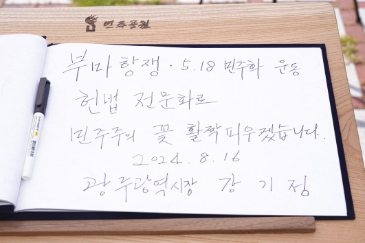▲ 강기정 광주광역시장이 16일 오후 부산광역시 중구 부산민주공원을 방문해 넋기림마당을 참배한 뒤 방명록을 작성하고 있다. |