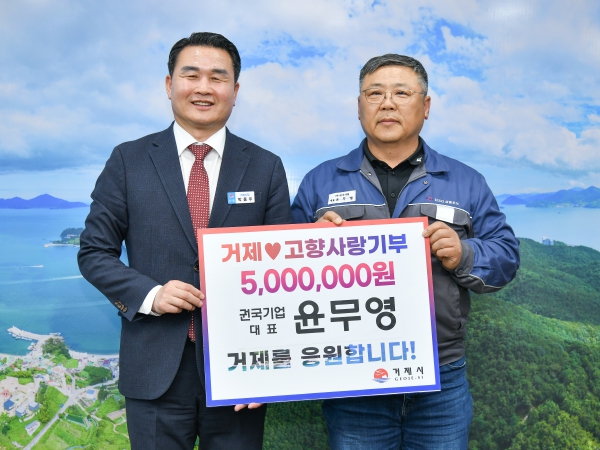 윤무영 대표는 거제시 동부면 출신으로 통영에서 선박 및 수상부류 구조물을 건조하는 ㈜권국기업을 경영하고 있으며, 이번에 고향사랑기부금 최고한도액인 500만원을 기탁했다.