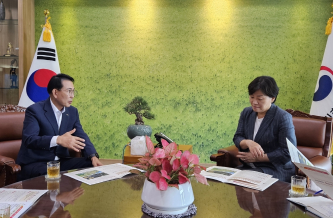 ▲ 19일 이완섭 서산시장이 농림축산식품부 장관을 만나 지역 농축산 발전 기반을 마련하기 위한 사업들을 소개했다. |