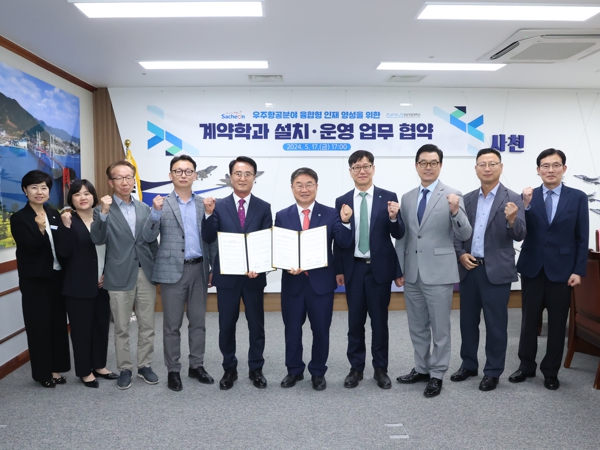 사천시와 경상국립대학교는 17일 오후 사천시청 열린시장실에서 사천GNU사이언스파크 계약학과(기술경영융합학과) 설치․운영을 위한 업무협약을 체결했다.