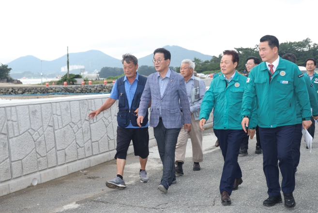 박완수 도지사는 먼저 거제시 학산지구를 방문했다. 학산지구는 주거시설이 해안 인근에 밀접해 있어 폭풍·해일로 인한 월파와 침수피해 발생이 우려되는 지역이다.