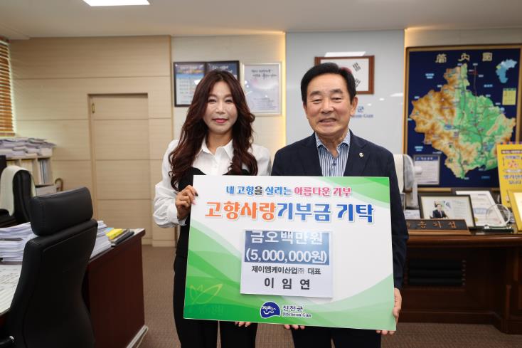 [뉴스서치] 이임연 제이엠케이산업㈜ 대표는 6일 진천군청을 방문해 군민의 복리증진을 위한 고향사랑기부금 500만 원을 전달했다.