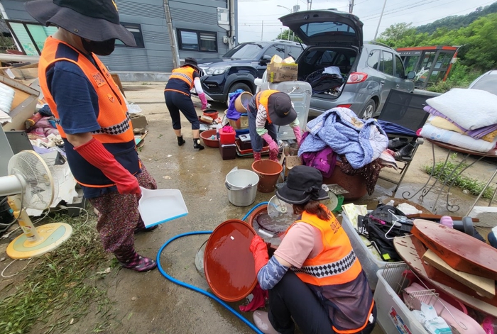이에 적십자봉사회, 의용소방대, 새마을단체, 자연보호협의회 등 30여 개 봉사단체에서 330여 명의 자원봉사자들이 30도가 넘는 무더운 날씨 속에서도 청통면, 남부동, 금호읍 등 호우로 인한 주택 침수 현장을 방문해 주택 청소 및 토사 정비, 의류 세탁, 구호물품 제공 등 피해 복구를 위해 힘을 보탰다.