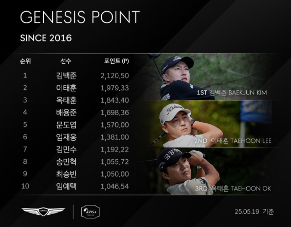 옥태훈의 뒤를 이어 ‘KPGA 클래식’ 우승자 배용준(25.CJ)가 1,698.36포인트로 제네시스 포인트 4위, ‘제44회 GS칼텍스 매경오픈’ 챔피언 문도엽(34.DB손해보험)이 1,570.00포인트로 제네시스 포인트 5위에 자리했다.
