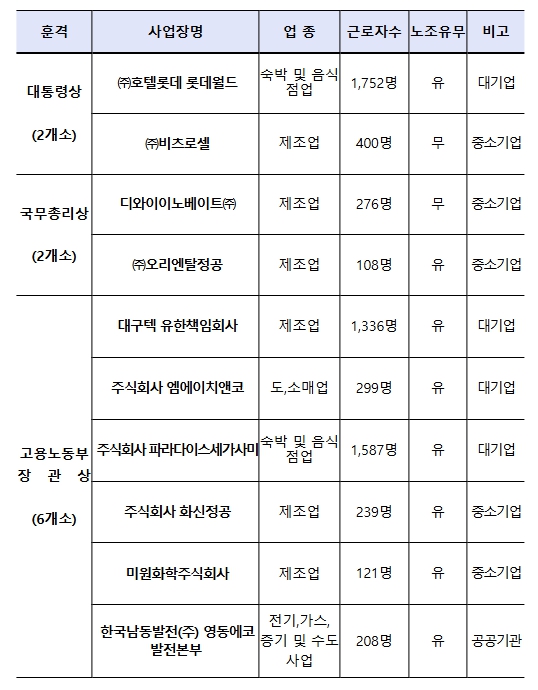 대통령상은 (주)호텔롯데 롯데월드, (주)비츠로셀, 국무총리상은 디와이이노베이트(주), (주)오리엔탈정공, 고용노동부 장관상은 대구텍 유한책임회사, 미원화학주식회사, 주식회사 엠에이치앤코, 주식회사 파라다이스세가사미, 주식회사 화신정공, 한국남동발전(주)영동에코발전본부가 선정의 영예를 안았다.