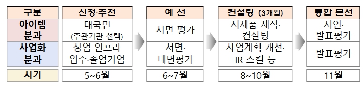 ‘창업 인큐베이팅 경진대회’는 창업 기반시설(인프라)마다 별도로 개최하던 창업경진대회들의 성과를 높이기 위해 올해 처음으로 통합 개최하는 창업기업(스타트업) 행사다. 일반적인 투자발표(피칭) 경쟁 방식에서 벗어나, 전국 각지의 창업 기반시설(인프라)을 이용하는 500여개의 기업 중 유망 창업팀을 별도 선별하여 3개월간 집중보육, 시제품 제작과 사업모델 고도화까지 돕는 ‘보육·성장형’ 경진대회로 개편했다.