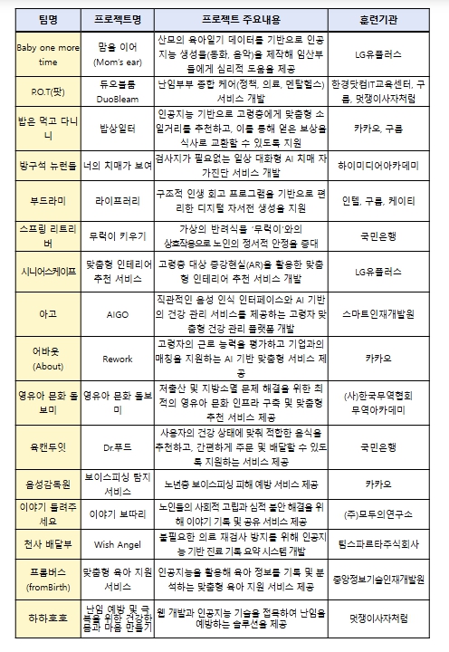 본선에 진출한 ‘음성감독원’ 팀은 통화 음성 정보를 인공지능으로 분석해 ‘보이스피싱’ 여부를 감지하여 전화금융사기 피해를 입기 쉬운 고령자를 보호하는 아이디어로 해커톤에 참여했다. ‘P.O.T(팟)’ 팀은 난임 부부에게 필요한 정책 및 의료 정보를 맞춤형으로 제공하는 애플리케이션을 제안했다.