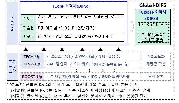 「초격차 프로젝트」는 기본지원(Core-DIPS)과 후속지원(Global DIPS) 등 2단계로 나누어 지원하며, 기술고도화(Tech Up), 개방형 혁신(Link Up),