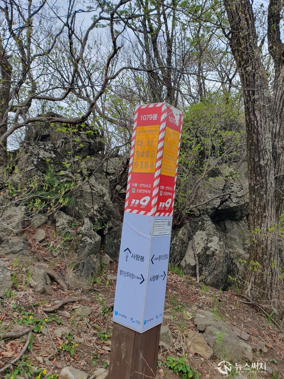 1079봉. 명지산 정상에서 동쪽방향으로 난 능선을 걷다보면 해발 1,013m 높이의 ‘사향봉’이 있다. 명지산 정상에서 사향봉 가는 능선 중간에 ‘1079봉’이 있다. ‘1079봉’ 앞에서는 사향봉 가는 길과 명지폭포로 내려가는 길이 갈린다.
