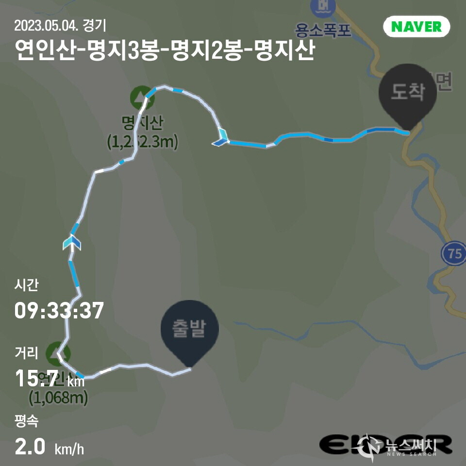 이번 연인산-명지산 종주산행 거리는 15.7km 였고, 산행시간은 점심식사시간과 휴식시간을 포함하여 총 9시간 33분이 소요되었다.
