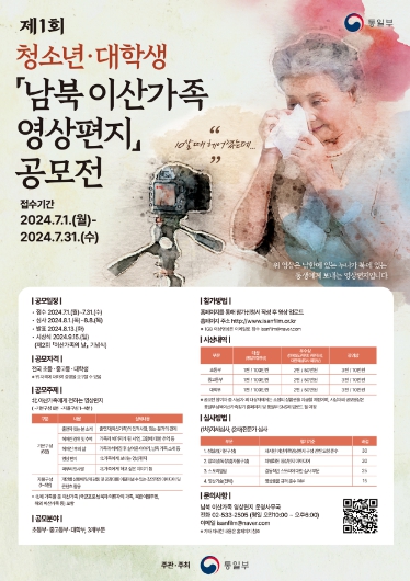 [뉴스서치] 통일부는 젊은 세대들이 분단과 이로 인한 이산가족들의 아픔을 이해하고 공감할 수 있도록 청소년과 대학생이 직접 참여하는'이산가족 영상편지 공모전'을 진행한다고 밝혔다.