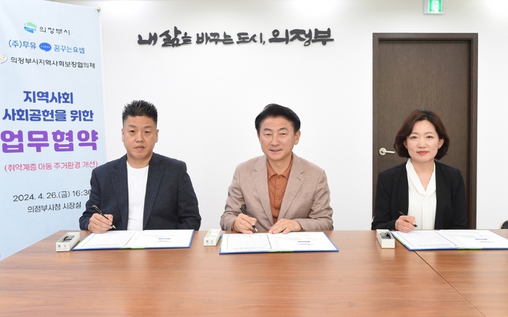 [뉴스서치] 의정부시는 취약계층 아동의 주거환경 개선을 위해 4월 26일 시장실에서 ㈜무유 꿈꾸는요셉(대표 김대홍), 의정부시지역사회보장협의체(민간위원장 윤연희)와 업무협약을 체결했다.