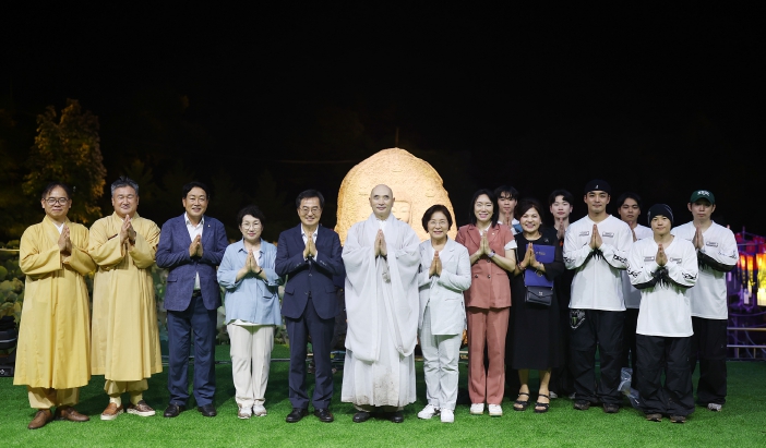 ▲ 27일 저녁 제22회 봉선사 연꽃축제에서 김동연 경기도지사가 호산 스님 및 참석자들과 기념촬영을 하고 있다 |
