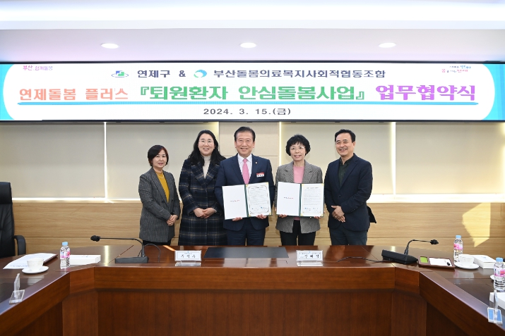 [뉴스서치] 연제구는 3월 15일 부산돌봄의료복지사회적협동조합(이사장 안혜경)과 퇴원환자들의 안정적 지역 복귀를 위한 ‘퇴원환자 안심돌봄사업’ 업무 협약을 체결했다.