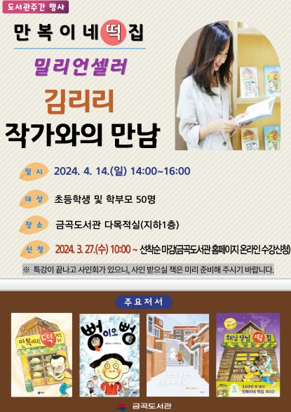 [뉴스서치] 부산광역시 북구는 제60회 도서관주간 행사의 일환으로 금곡도서관에서 4월 14일 오후 2시부터 4시까지 밀리언셀러'만복이네 떡집'시리즈의 저자인 ‘김리리 작가’를 초청하여 작가와의 만남을 가진다.