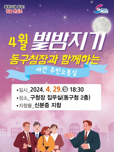 국회의원선거가 종료됨에 따라 그간 할 수 없었던 주민과의 소통을 위해 2024년 별밤지기 구청장 야간 주민소통실을 4월부터 시작한다.