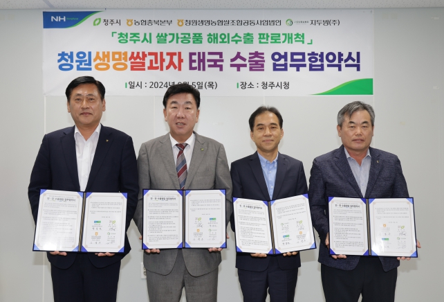 이날 협약식에는 이범석 청주시장과 황종연 농협충북본부 총괄본부장, 김영우 청원생명쌀조합공동사업법인 의장, 그리고 태국으로 유통하는 임준호 지두방(주) 대표이사가 참석했다.