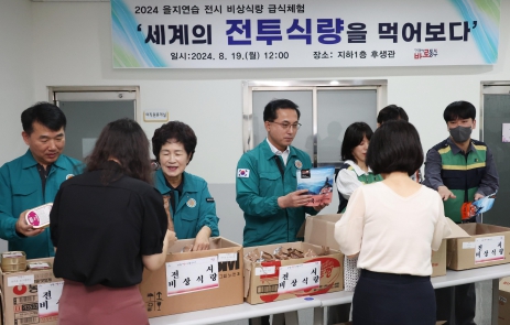 [뉴스서치] 대전 동구는 2024 을지연습 첫날인 20일 동구청 후생관에서 공무원, 유관기관 관계자 등 500여 명이 참여한 가운데 전시 대비 세계 전투식량 전시 및 체험 ’세계 전투식량을 먹어보다‘를 진행했다고 밝혔다.