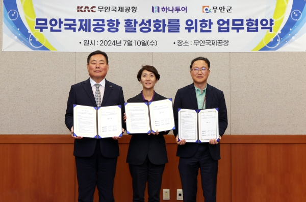김 산 무안군수, ㈜하나투어 송미선 대표이사, 한국공항공사 윤상규 무안지사장은 이날 협약식에서 무안국제공항의 여객 증대와 공항 활성화를 위해 공동 노력하기로 했다.