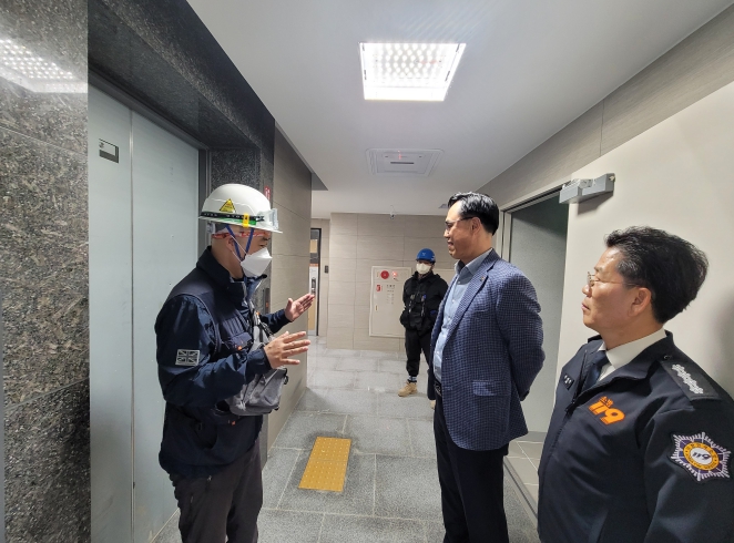 ▲ 경남소방본부장 진주시 신축 공동주택 제연설비 성능시험 현장 방문 |