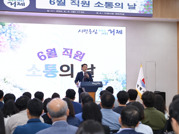 [뉴스서치] 거제시는 지난 4일 시청 대회의실에서 직원 150여 명이 참석한 가운데 6월 직원 소통의 날을 개최했다.