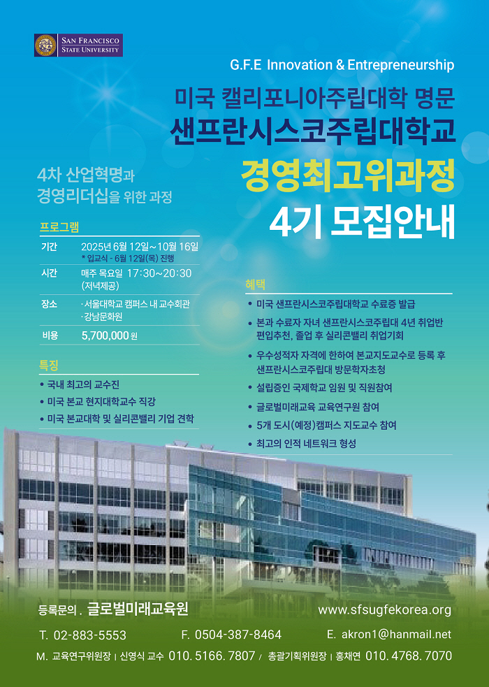 [뉴스서치] 글로벌 혁신 교육의 선두주자인 미국 캘리포니아주립대학 시스템의 명문, 샌프란시스코주립대학교(San Francisco State University, SFSU)가 미래 경영 환경을 이끌어갈 리더들을 위한 ‘글로벌 CEO 경영최고위과정(GFE Innovation & Entrepreneurship)’ 4기 참가자를 모집하며 교육계의 이목을 집중시키고 있다.