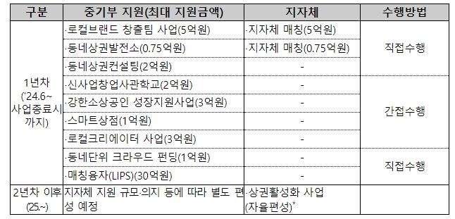 1년차에는 중기부가 공동 상표화(브랜딩), 상품개발 등 지역사업(로컬비즈니스) 확장과 지역 예비소상공인의 창업·혁신 프로그램 운영에 사용할 수 있는 자금 5억원을 지원하고, 2년차에는 지자체가 상권연계 축제기획, 공동상표화(브랜딩) 확장 등 골목산업을 확산할 수 있는 자금 5억원을 지원한다.