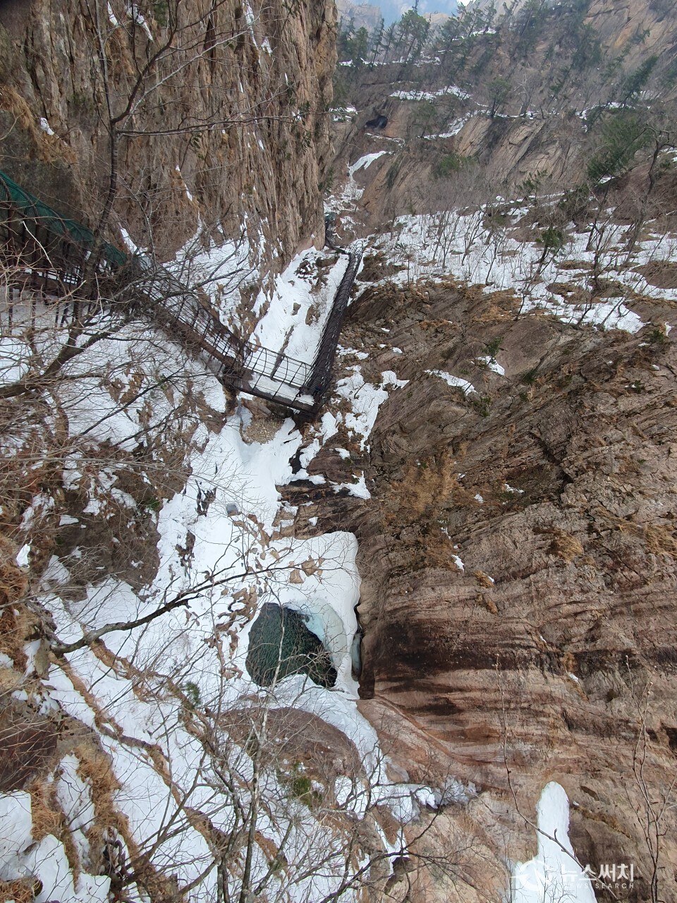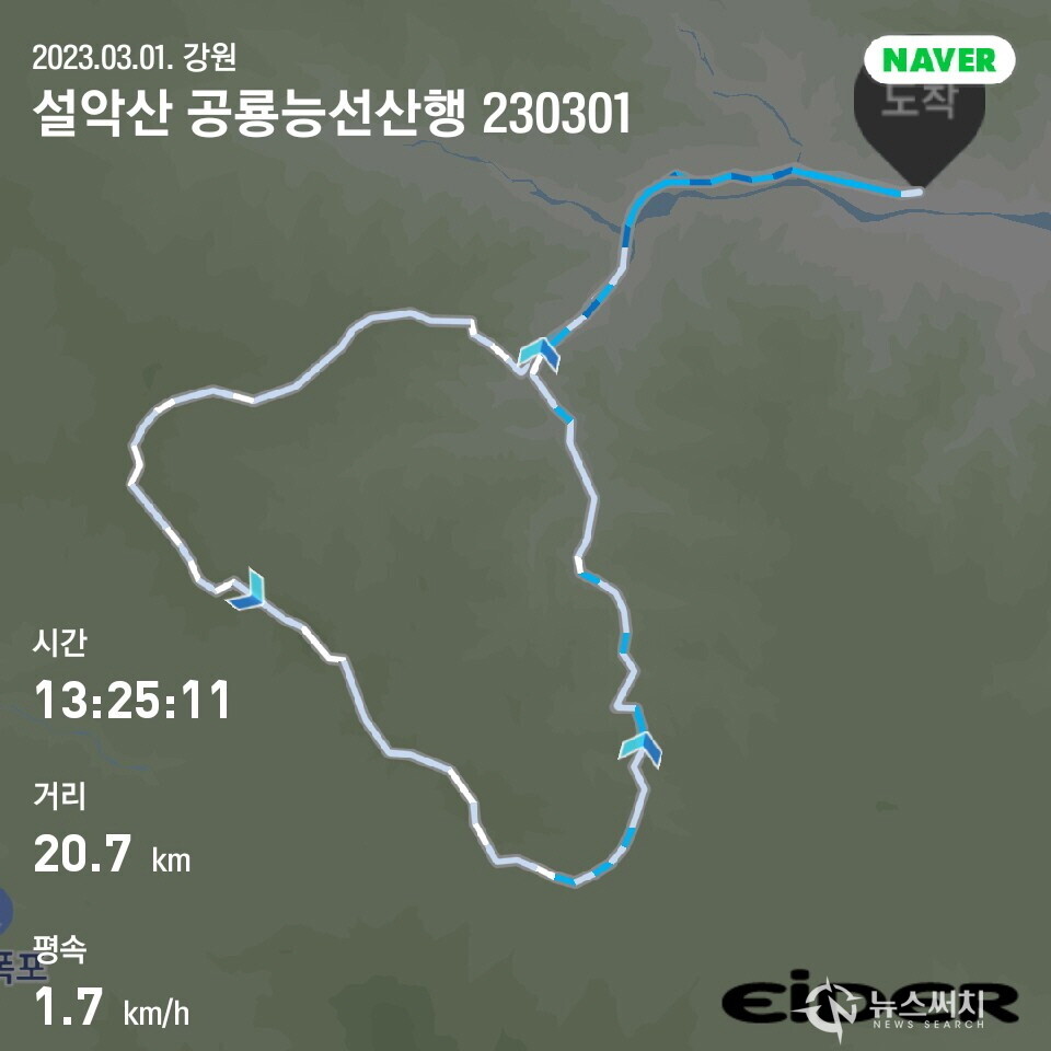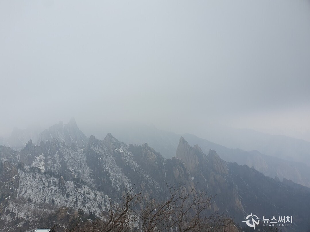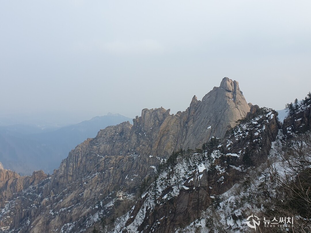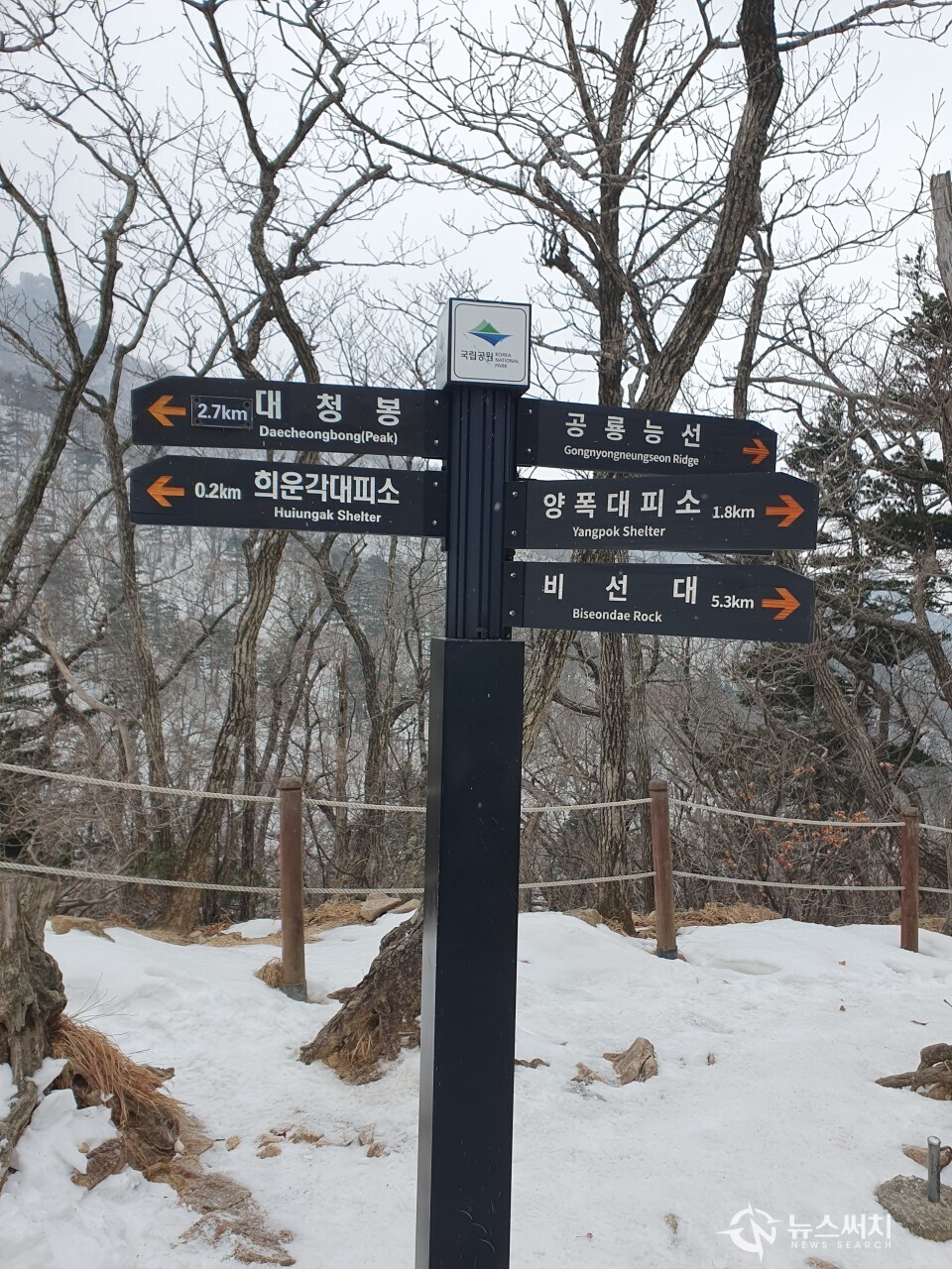 [뉴스써치] 지난 3월 1일 기자는 ‘공룡능선 종주산행’을 시작하였고 설악동 주차장에서 출발하여 설악동매표소, 와선대, 비선대를 거쳐 마등령삼거리까지 오르막 산행을 한 뒤 공룡능선의 중심부에 접어들었다. 공룡능선에 진입한 뒤 ‘나한봉(해발 1,297m)', '큰새봉(해발 1,278m)'을 지나 오전 10시 14분 ‘1275봉’에 도착하였다.
