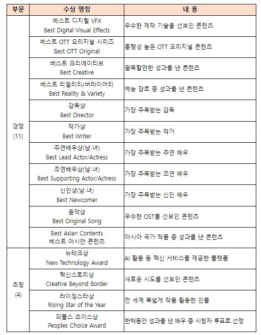 초청 부문은 ▲ AI 활용 등 혁신적 서비스를 제공한 플랫폼에게 수여하는 ‘뉴테크상’, ▲ 새로운 장르와 시도를 선보인 콘텐츠에게 수여하는 ‘혁신스토리상’, ▲ 세계에서 폭넓게 작품 활동을 한 인물에게 수여하는 ‘라이징스타상’, ▲ 한 해 동안 뛰어난 성과를 낸 배우를 대상으로 全 세계 시청자 투표로 선정하는 ‘피플스 초이스상’ 등을 포함한 4개로 구성했다.