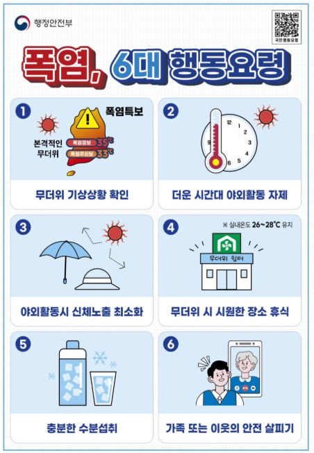 김광용 재난안전관리본부장은 “정부는 폭염으로 인한 인명피해 최소화를 위해 관계기관과 함께 가용 자원을 최대한 동원해 총력 대응하겠다”라며, “국민 여러분께서도 온열질환 예방을 위해 무더운 시간대 야외 활동을 자제해 주시고, 충분한 휴식과 수분 섭취 등 국민행동요령을 적극 실천해 주시기 바란다”라고 말했다.
