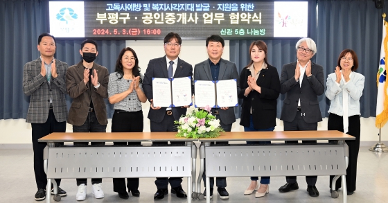 [뉴스서치] 부평구는 3일 구청 나눔방에서 한국공인중개사협회 인천광역시부평구지회와 ‘고독사 예방 및 복지사각지대 발굴’ 협력을 위한 업무 협약을 체결했다.