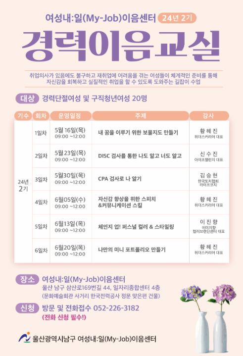 [뉴스서치] 울산 남구여성내:일(My-Job)이음센터는 육아, 가사 등으로 경력이 단절된 여성 및 경제활동을 준비 중인 미취업여성들에게 체계적인 취업준비를 통해 취업의지를 높이고 성공취업할 수 있도록 돕는‘2024년 경력이음교실 2기’참여자를 모집 중이라 밝혔다.