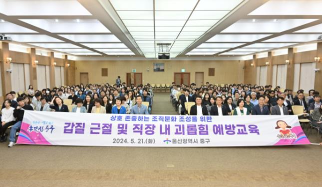 [뉴스서치] 울산 중구가 5월 21일 오후 3시 중구청 대회의실에서 간부 공무원과 신규 임용자, 승진자 등 직원 250여 명을 대상으로 갑질 근절 및 직장 내 괴롭힘 예방교육을 실시했다.
