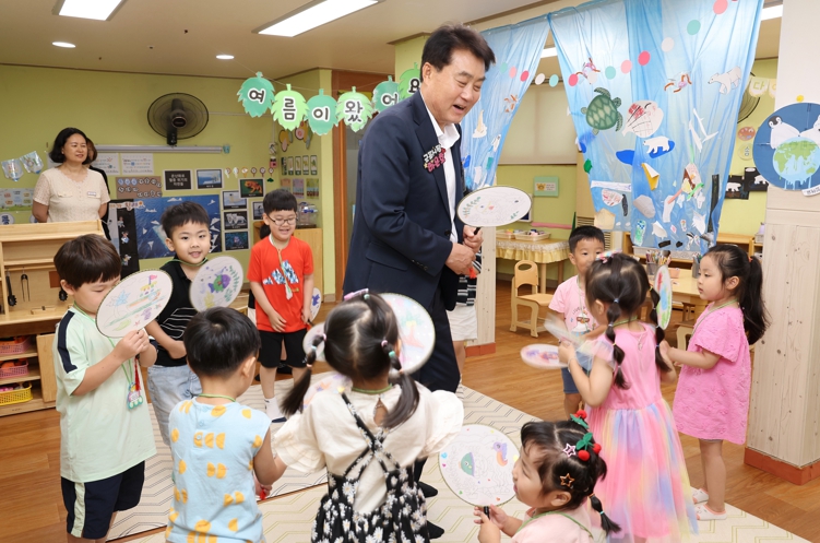 이날 일일보조교사로 나선 하은호 군포시장은 초록나무반 아동 12명과 더운 여름을 시원하게 보내는 방법에 대해 이야기를 나누며 아동들이 각자 부채를 꾸미며 창의력을 발휘할 수 있도록 돕는 시간을 가졌다.