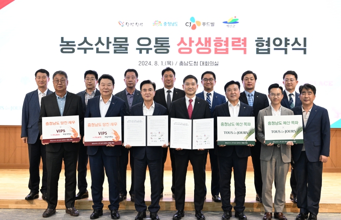 김태흠 지사는 1일 도청 대회의실에서 오성환 당진시장, 최재구 예산군수, 김찬호 CJ푸드빌 대표와 ‘충남 농수산물 유통 활성화를 위한 상생 협력 협약’을 체결했다.
