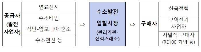 청정수소발전 입찰시장은 청정수소를 발전 연료로 사용하여 생산된 전기를 구매‧공급하는 제도이다. 동 시장에는 국내 청정수소 인증기준(수소 1㎏당 온실가스 배출량 4㎏CO2e 이하)을 충족한 연료를 사용하는 발전기만 참여 가능하다. 올해 입찰물량은 6,500GWh, 계약기간은 15년이다. 실제 발전은 사업 준비기간(3년, 첫 시장임을 고려하여 1년 유예 부여)을 거쳐 ’28년까지 개시해야 한다.