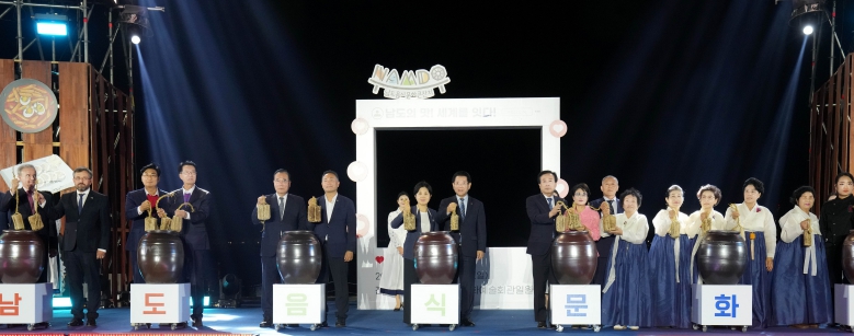 ▲ 제30회 국제남도음식문화큰잔치가 29일 성황리에 막을 내렸다. 김영록 전라남도지사가 27일 목포문화예술회관 일원에서 “남도의 맛! 세계를 잇다!”라는 주제로 열린 ‘제30회 국제남도음식문화큰잔치 개막식’에서 주요내빈들과 장 담그기 퍼포먼스를 하고 있는 모습 |