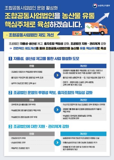 특히, 이날 간담회에서 한 차관은 조공법인 제도 도입(’04년) 이후 양적 성장은 있었으나 조공법인 독립 경영 체계 미정립, 운영 투명성 부족 등 문제점도 있어 내실있는 성장에 한계가 있었다며, 조공법인을 지역 농축협이 생산한 농축산물 유통의 핵심주체로 육성하기 위해 ① 조공법인의 자율성ㆍ생산성 제고, ② 조공법인 운영의 투명성 확보, 출자조합의 책임성 강화, ③ 조공법인 지원 및 관리체계 강화 등 3대 정책분야를 설정, 10대 중과제, 19개 세부과제를 마련했다고 밝혔다.