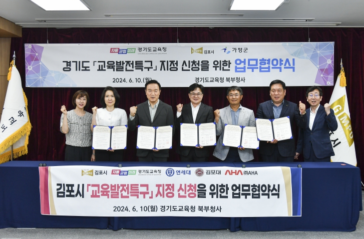 ▲ 김포시는 지난 6월 10일 경기도 교육청에서 ‘교육발전특구 시범사업 운영’을 위한 업무협약을 체결한 바 있다. 왼쪽부터 서혜정 경기도교육청 정책기획담당관, 박진영 김포대 총장, 임태희 경기도교육감, 김병수 김포시장, 이남규 연세대 산학교육분과장, 구기도 (주)아하 대표, 이창우 김포시 교육지원과장. |
