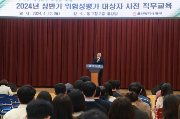 [뉴스서치] 울산 동구는 4월 22일 오전 10시 동구청 2층 대강당에서 위험성평가 담당자 및 근로자 대표, 도급용역위탁사업자 등 360여명을 대상으로 위험성평가 사전 직무교육을 실시하였다.