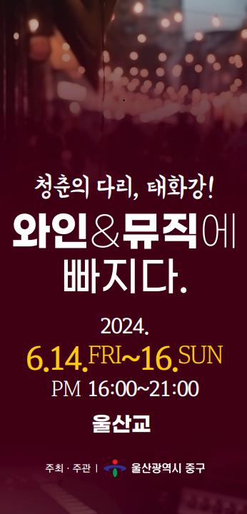 ‘청춘의 다리’ 야외카페는 ‘태화강! 와인·뮤직에 빠지다’라는 주제로, 오후 4시부터 저녁 8시까지 운영된다.