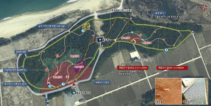 해양치유 맨발걷기 체험코스는 관동팔경 중 하나인 월송정 소나무 숲과 동해바다를 배경으로 기존의 길에 2.2km를 연장하여 조성할 예정이다.