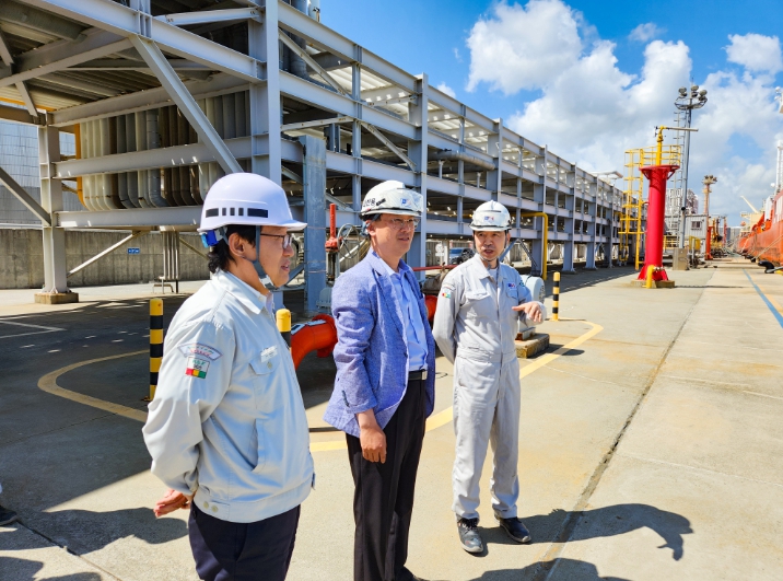 ▲ 고석진 관세청 통관국장(가운데) 28일 울산시 온산항 소재 ㈜정일스톨트헤븐울산을 방문하여 오일탱크터미널 시설 현장을 둘러 보고 있다. |