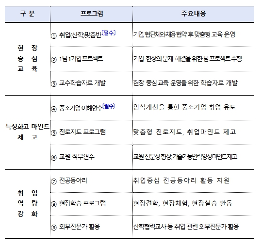 지역산업 맞춤형 특화교육은 지역주력산업 연계형과 일‧학습병행 연계형의 투 트랙으로 지역특화학교를 지정하여 진행되며, 기존 5개교에서 10개교로 확대한다. 또한, AI, 스마트 제조 등 첨단 유망분야 교육과정 확대를 위해 신기술 중점지원학교를 기존 20개교에서 25개교로 확대하여 지원한다.