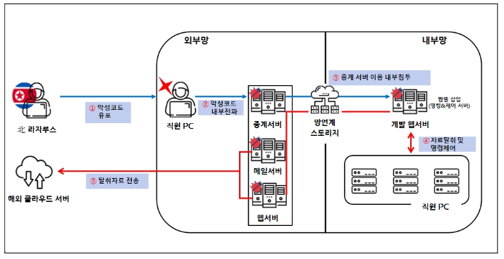 북한 해킹조직은 2022년 11월부터 ‘가’ 방산업체 외부망 서버를 해킹하여 악성코드에 감염시킨 후 테스트 목적으로 열려있는 망 연계 시스템의 포트를 통해 회사 내부망까지 장악했다. 개발팀 직원 컴퓨터 등 내부망의 중요자료를 수집하여 국외 클라우드 서버로 자료를 빼돌렸다.